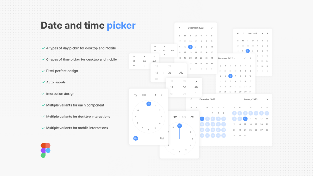 Crafted designs made in Figma for date-picker and time-picker features, easy to integrate and adapt to your personal design system.